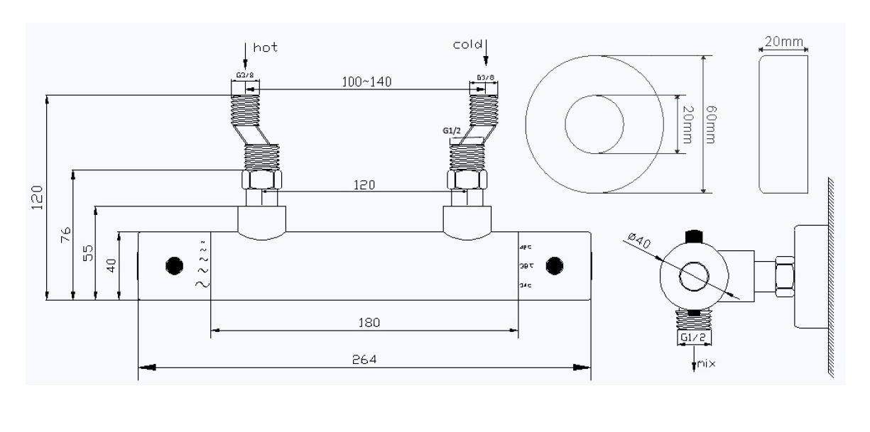 Deze douchethermostaat is geschikt voor 1/2 inch muuraansluitingen met een hartafstand van 120 mm. Controleer vooraf altijd de afstand tussen de aansluitingen in de muur. Voor montage gebruik je PTFE tape of afdichtpasta, een steeksleutel en een waterpomptang. Eerst meten, dan bestellen voorkomt retouren.
