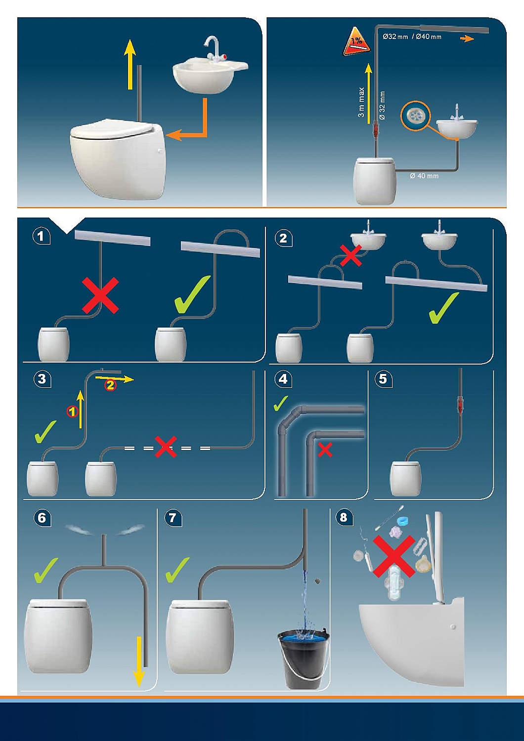 Bij het spoelen vermaalt de pomp het afval en voert het via een smalle leiding af. Zo is geen standaard afvoer nodig en blijft de kans op verstopping klein.