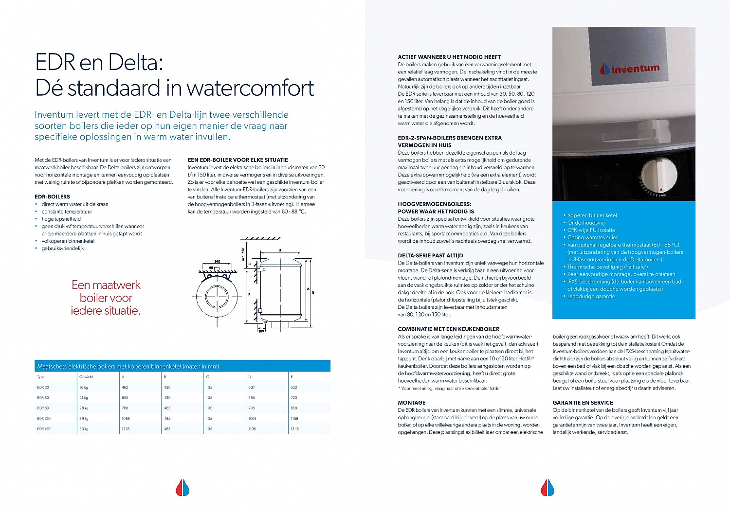 Met de Inventum EDR boilers hebben we voor iedere situatie een maatwerkboiler beschikbaar. Inventum heeft in haar assortiment laagstroom boilers, 2-span boilers, hoogvermogen boilers en hoogvermogen 3 fases boilers. Uniek is de Inventum Delta lijn. Deze zijn gemaakt voor een horizontale montage en kunnen eenvoudig op plaatsten met weinig ruimte geplaatst worden. Verkrijgbaar in verschillende uitvoeringen voor vloer-, wand- en plafondmontage.