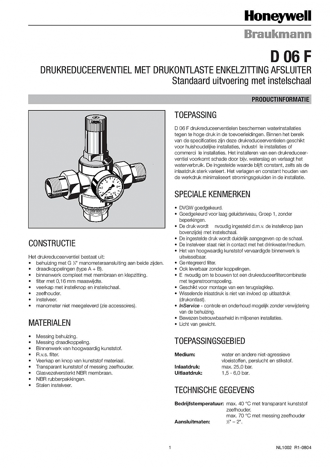 Drukreduceertoestellen van dit type beschermen huishoudelijke drinkwater installaties tegen drukstoten uit het leidingnet. Kunnen tevens gebruikt worden voor industriele of commerciele installaties. Door het installeren van een drukreduceertoestel voorkomt u schade van overdruk en bespaart u water. De uitgangsdruk is altijd constant ook als de inlaatdruk sterk varieert. Het reduceren van de druk zorgt tevens voor het voorkomen van stromingsgeluiden in uw installaties.