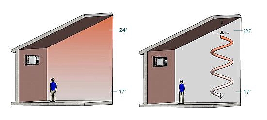 Tegelijkertijd wordt energie bespaard doordat de onder het dak opééngehoopte, nutteloze warme lucht weer op werkniveau wordt teruggebracht (= daling van de temperatuurgradient).