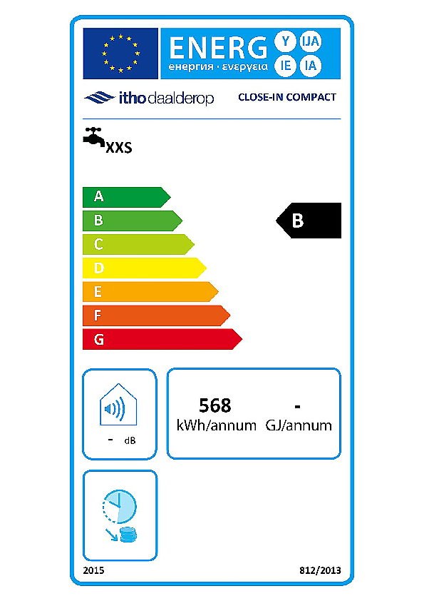 Daalderop Close-in Compact boiler elektrisch close-in, energie-efficiëntieklasse B, boilervat koper, mantel kunststof, tankinhoud 5L, nom. vermogen 1.5kW, aansluitspanning 230V, frequentie 50Hz, toepasbaar bij normale waterdruk, opwarmtijd van 10 grC - 65 grC 20min, plaatsing verticaal