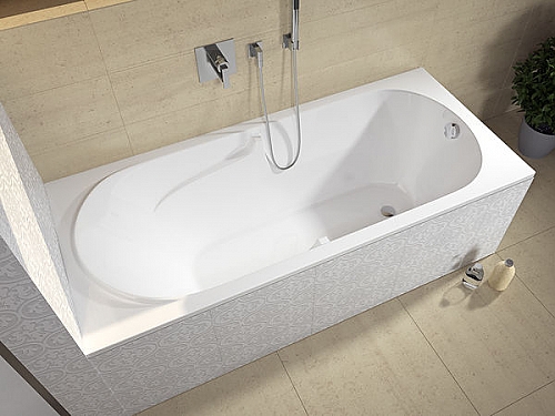 Inbouwbad, hoogglans wit acryl bad, met armsteunen, afvoer bij het voeteneind. Tevens verkrijgbaar met de whirlpoolsystemen: Air of Flow.