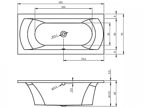 Inbouwbad, hoogglans wit acryl, rechthoekig met afgeronde binnenvorm, afvoer aan de zijkant. Tevens verkrijgbaar met de whirlpoolsystemen: Air, Flow, Joy of Bliss.