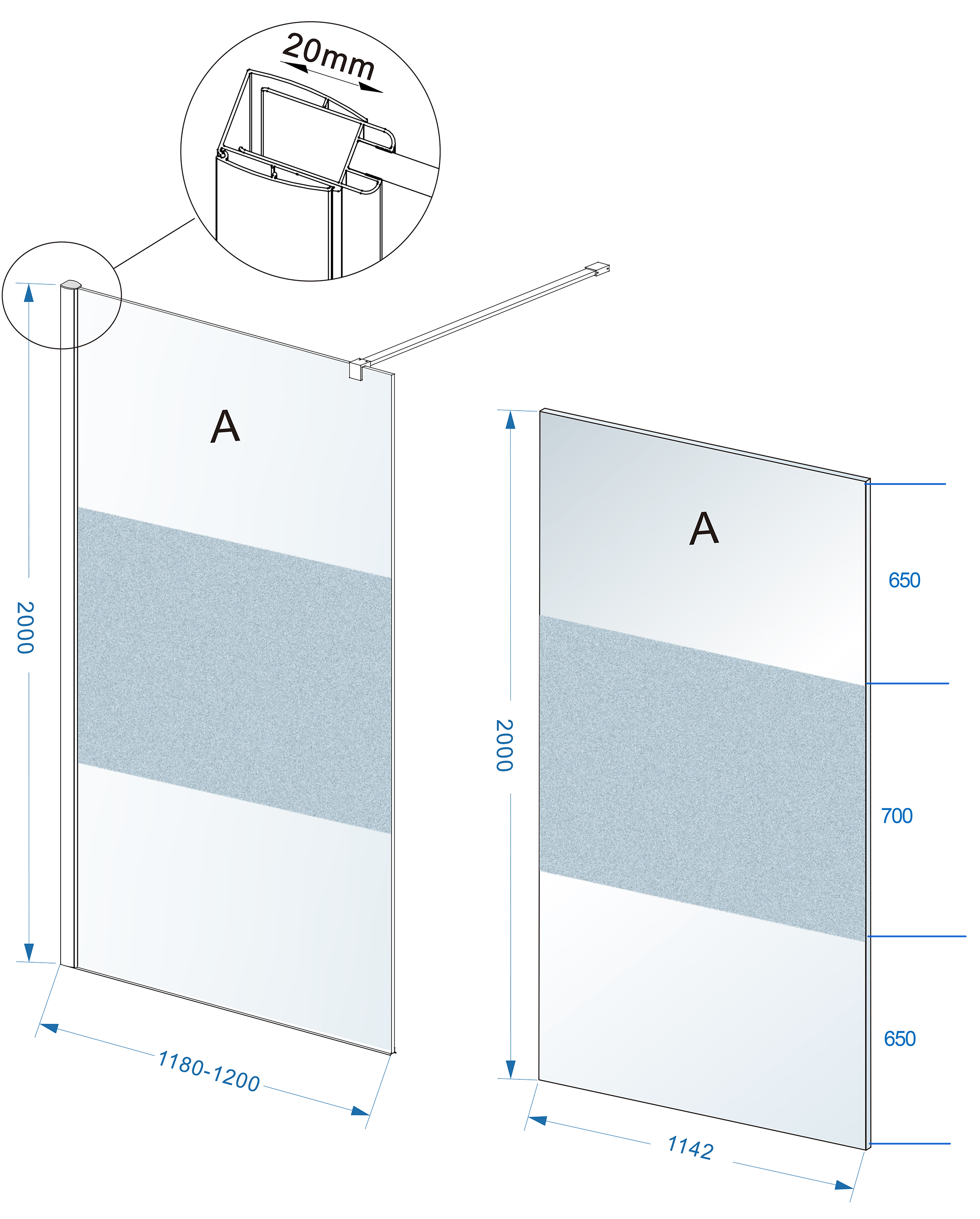 339,00 Volgende werkdag in huisItaly Sanitair inloopdouche + muurprofiel 1000x2000 10mm NANO gedeeltelijk matglas