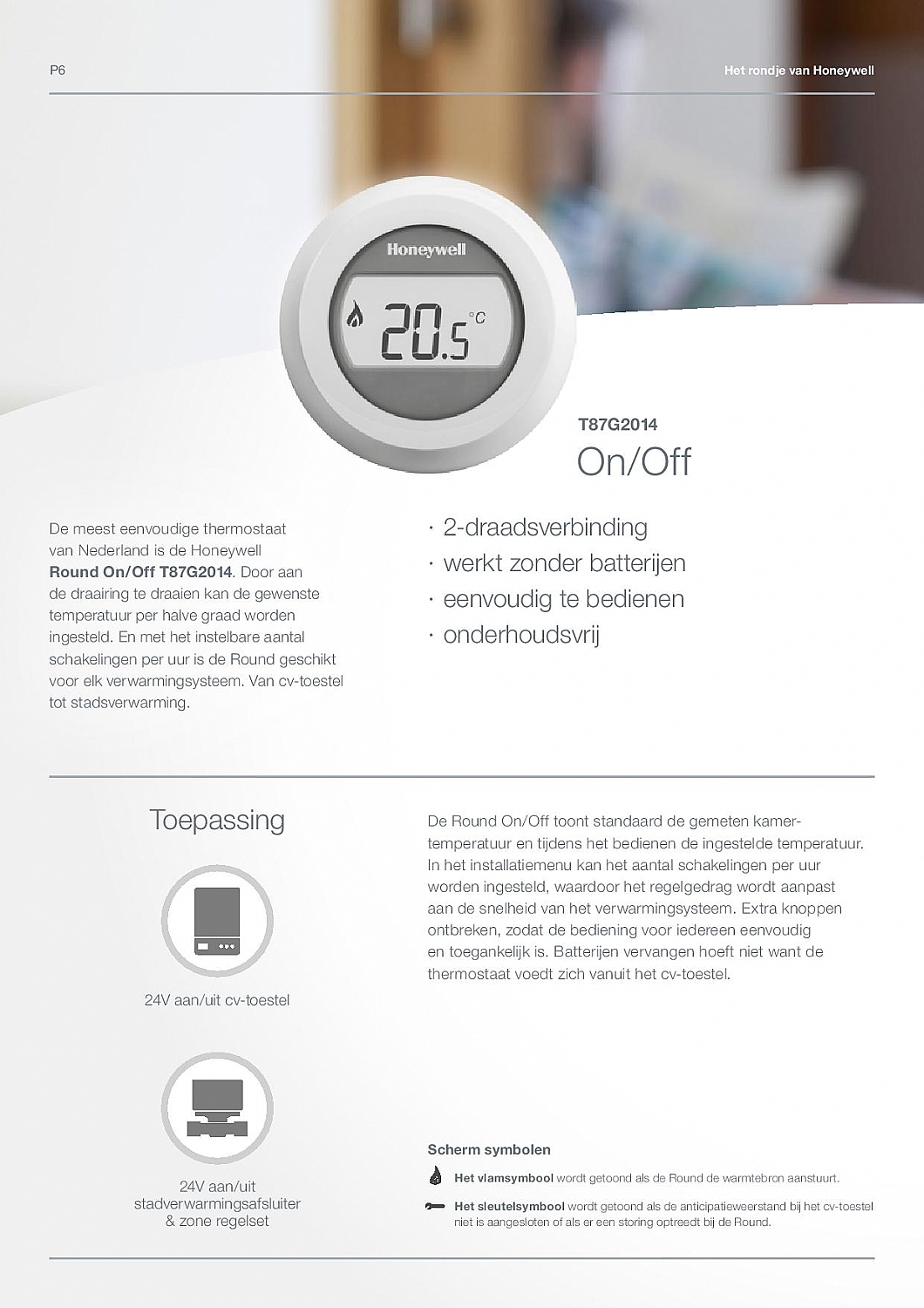 Bij de vernieuwde Honeywell Round zijn alle kwaliteiten behouden gebleven. Deze innovatieve Honeywell thermostaat sluit nu nog beter aan bij de nieuwe generatie cv-toestellen en warmtepompen. Voor elke verwarming een Honeywell Round die past. De meest toegepaste modellen passen op de bestaande grondplaten, zodat de grondplaat bij vervanging kan blijven hangen. Nieuw is het verlichte en vergrote display voor optimale uitleesbaarheid.