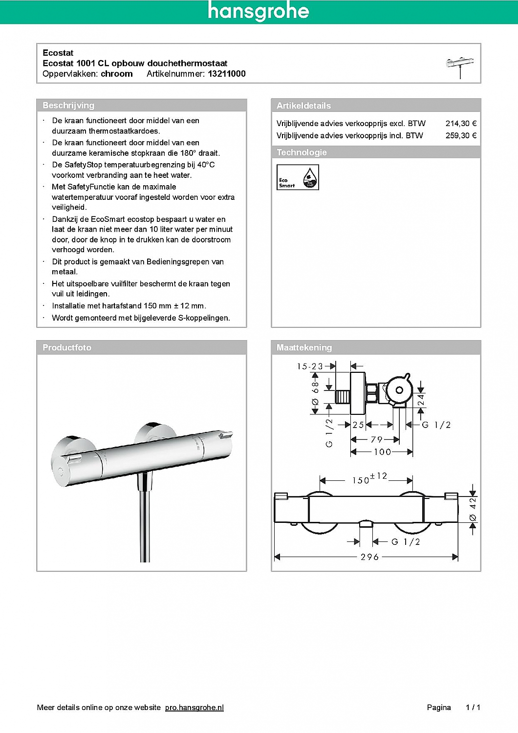 Heb je een bestaande douchekraan met 150 mm hartafstand? Dan past deze Hansgrohe Ecostat 1001 CL vrijwel altijd zonder aanpassingen. De meegeleverde S-koppelingen maken installatie eenvoudig.