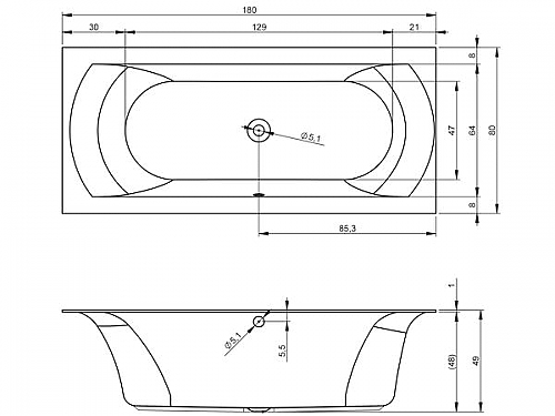 Inbouwbad, met lage badrand, hoogglans wit acryl, rechthoekig met afgeronde binnenvorm, afvoer aan de zijkant. Tevens verkrijgbaar met de whirlpoolsystemen: Air, Flow, Joy of Bliss.