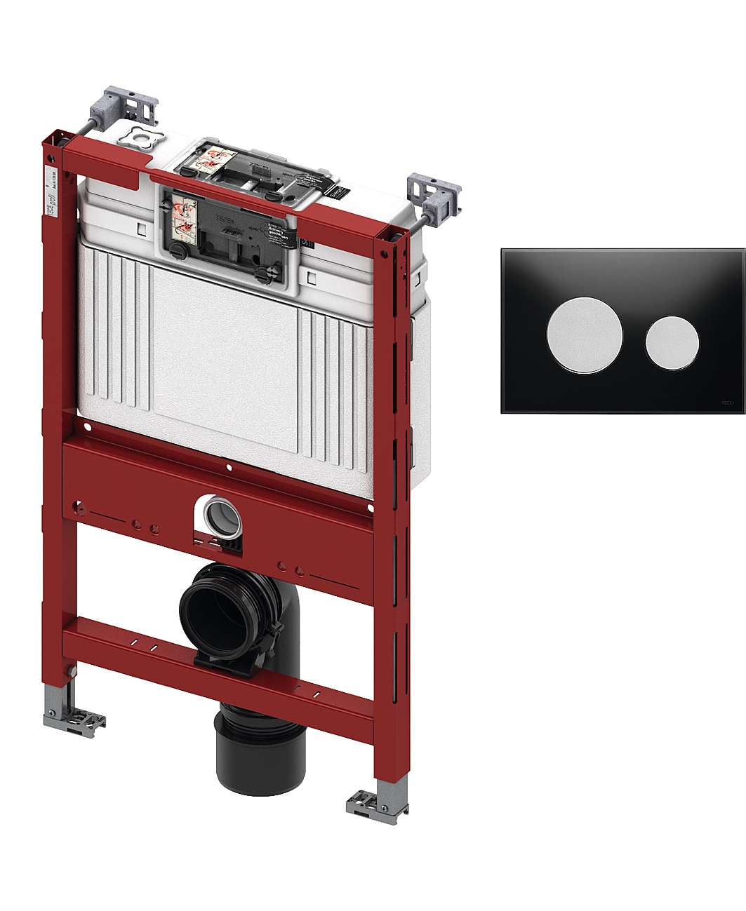 TECEprofil wc-inbouwframe met Uni-spoelkast, bouwhoogte 820 mm. Wc-inbouwreservoir voor bevestiging aan TECEprofil profielbuizen of montage in voorwand of hoekopstelling.