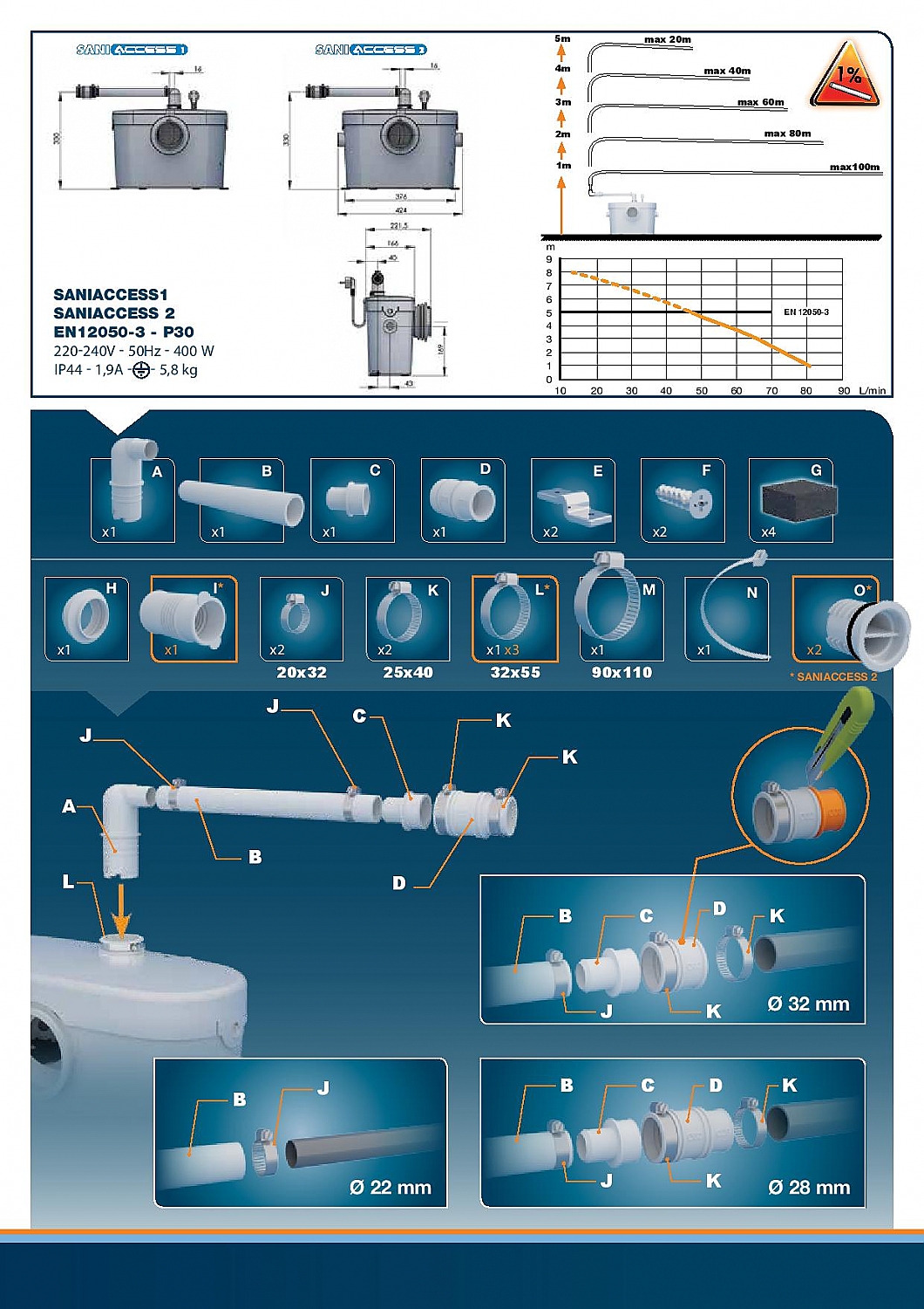 De opvoerhoogte is 5 meter verticaal en 100 meter horizontaal via een afvoerbuis met diameter 22, 28 of 32 mm.