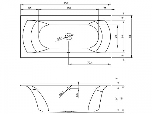 Inbouwbad, met lage badrand, hoogglans wit acryl, rechthoekig met afgeronde binnenvorm, afvoer aan de zijkant. Tevens verkrijgbaar met de whirlpoolsystemen: Air, Flow, Joy of Bliss.