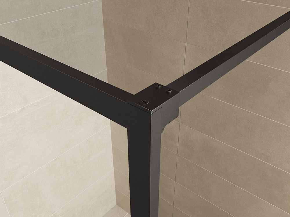 De mat zwarte stabilisatiestang en profieldelen geven de douche een moderne uitstraling zonder te overheersen. In combinatie met lichte tegels of betonlook ontstaat een mooi contrast, terwijl het glas zelf transparant en rustig blijft.